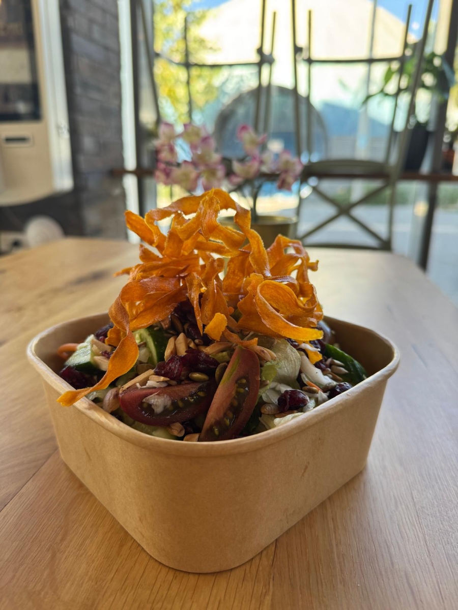 חסה, כרוב לבן, גזר מגורד, עגבניות שרי, מלפפון, קריספי בטטה ומיקס אגוזים